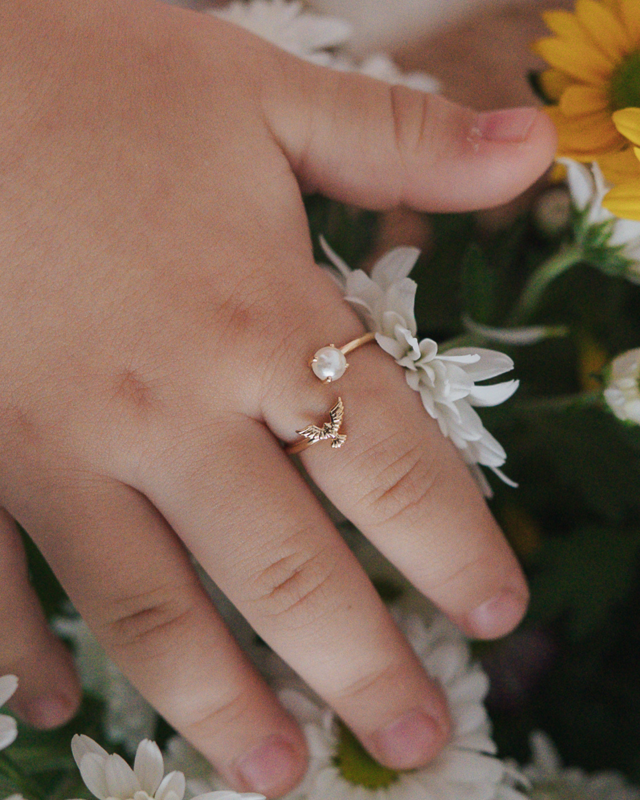 Anel Baby Espírito Santo com Pérola Ajustável (6 meses a 3 anos) – Banhado a Ouro 18k