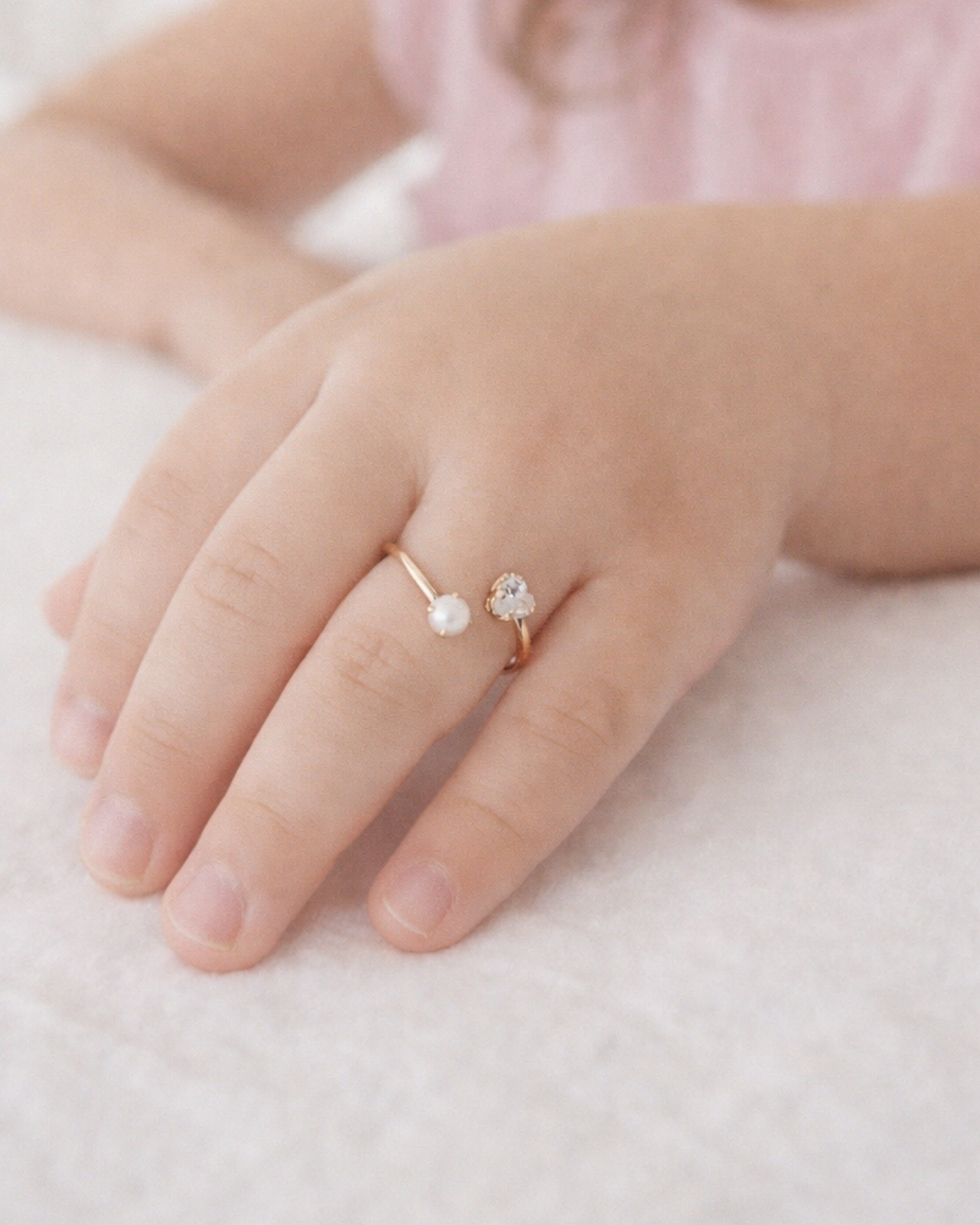 Com um design encantador e sofisticado, o anel combina o brilho delicado da zircônia em formato de coração — representando a alegria e a luz da infância — com a suavidade da pérola, símbolo de carinho, pureza e conexão eterna.