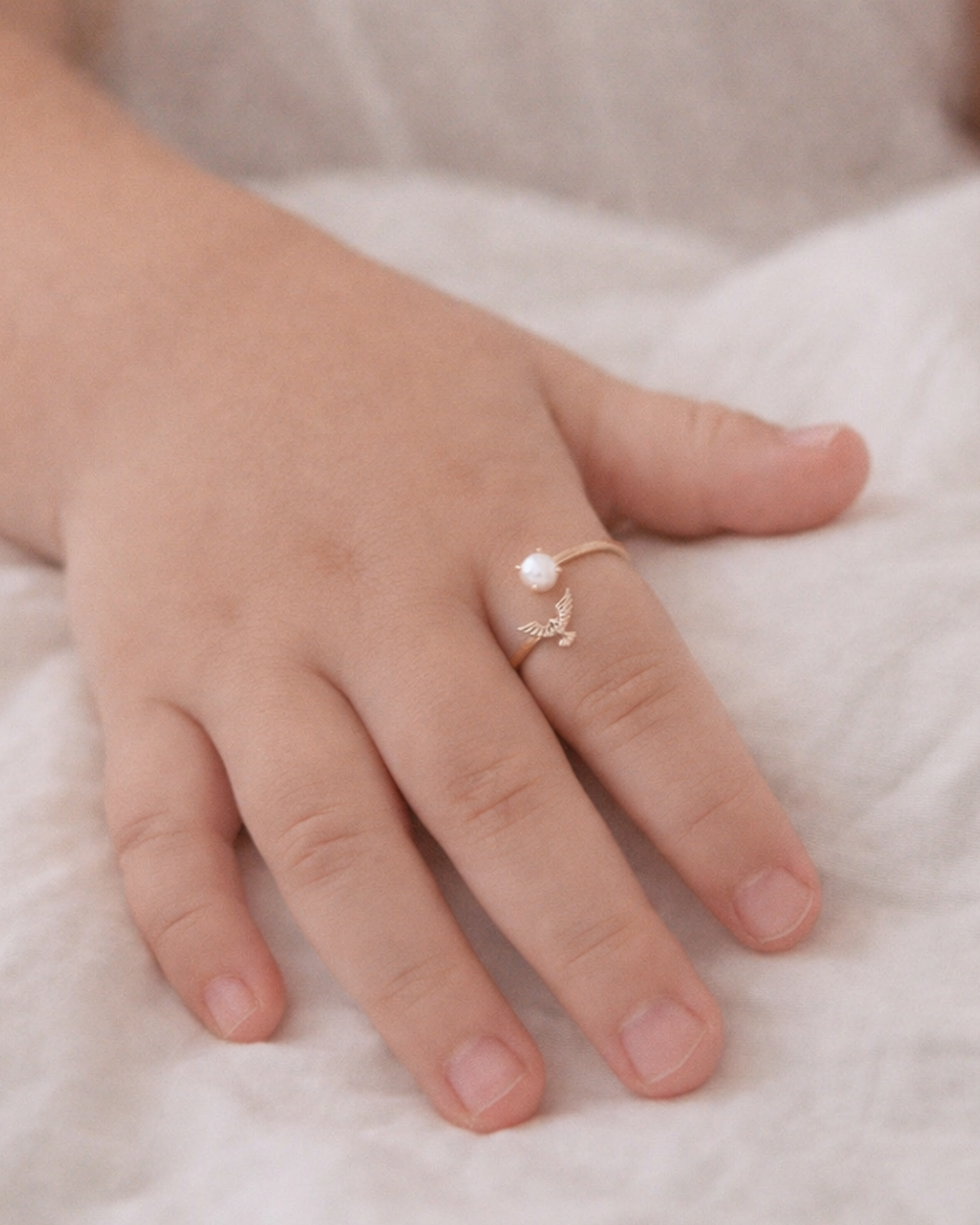 Seu design ajustável permite encaixe confortável no dedo, adaptando-se ao crescimento da criança sem perder a delicadeza. O detalhe do Espírito Santo simboliza cuidado e bênçãos, enquanto a pérola traz um toque clássico e sofisticado — ideal para meninas que já começam a expressar seu estilo com leveza e brilho.