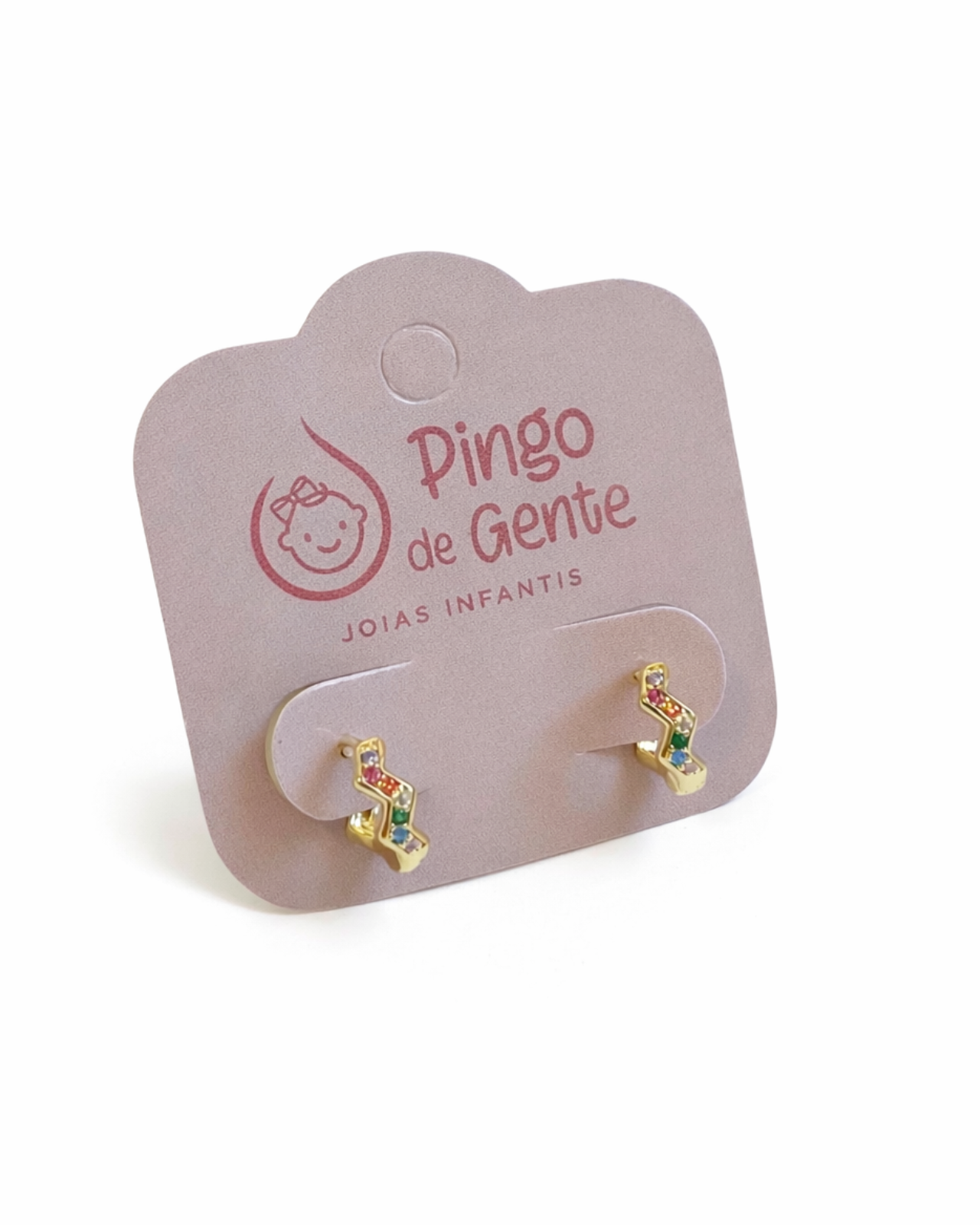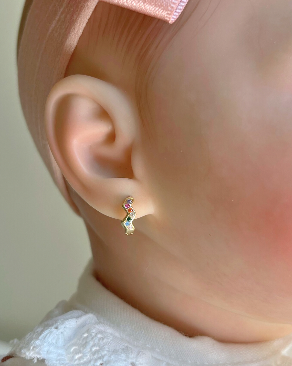 Argola click baby Luna com pedras de micro zircônias no coloridas no formato zig zag triangular.