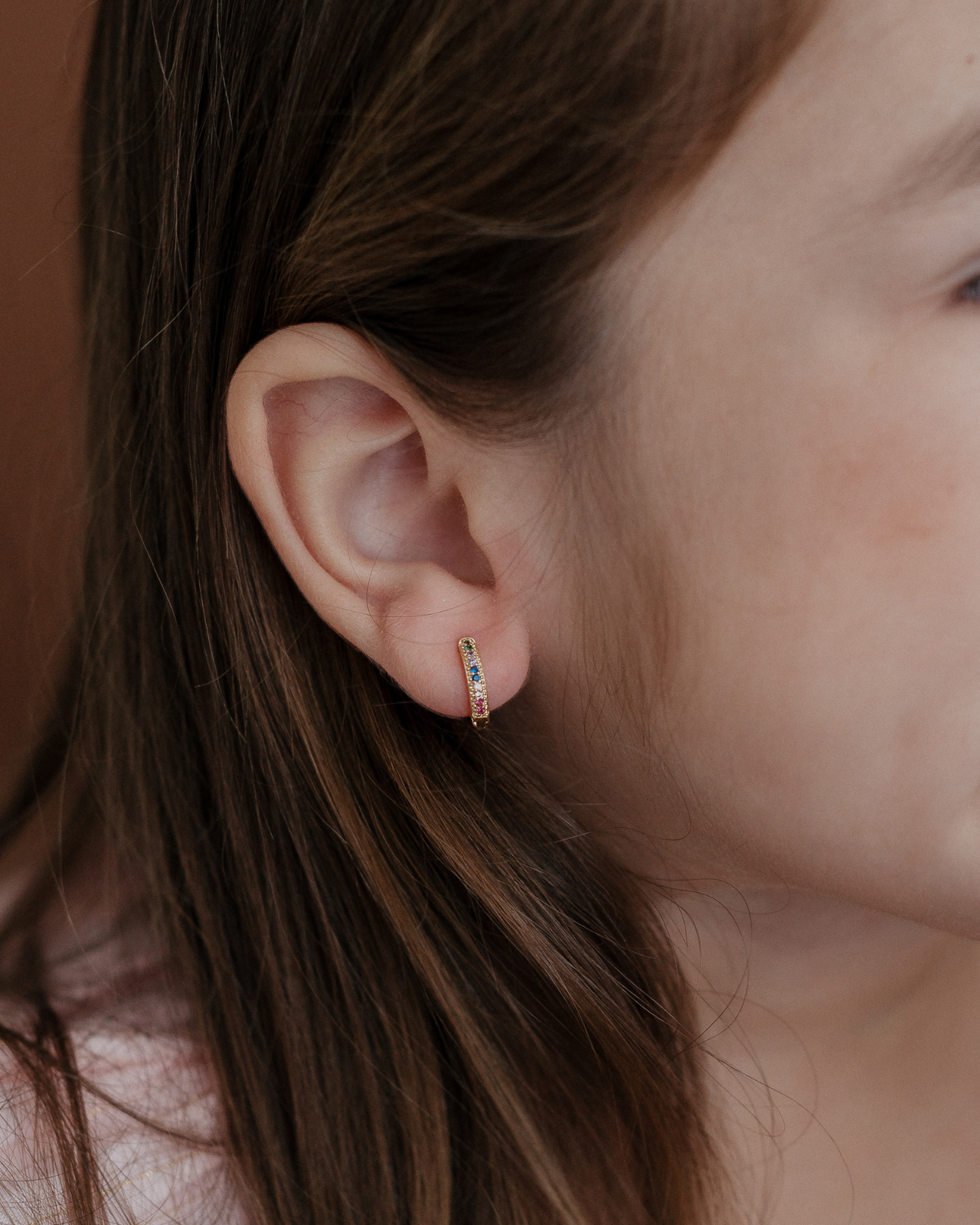 Delicada, segura e cheia de brilho na medida certa. A argolinha de click infantil com 10 micro zircônias cravejadas coloridas é perfeita para iluminar o visual das pequenas com conforto e segurança. Banhada a ouro 18k, hipoalergênica, livre de níquel (não causa alergia).