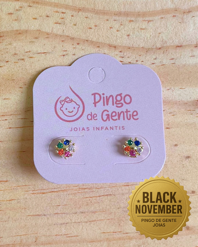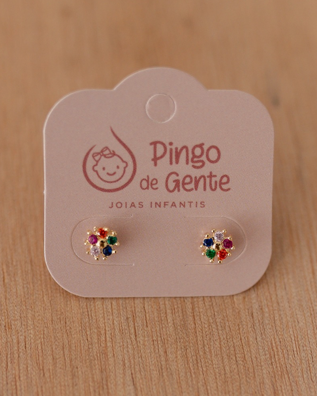 Delicado e cheio de brilho, o brinco Amanda é uma florzinha de coração com zircônias cravejadas coloridas. É perfeito para realçar a beleza das pequenas com muito charme e segurança.