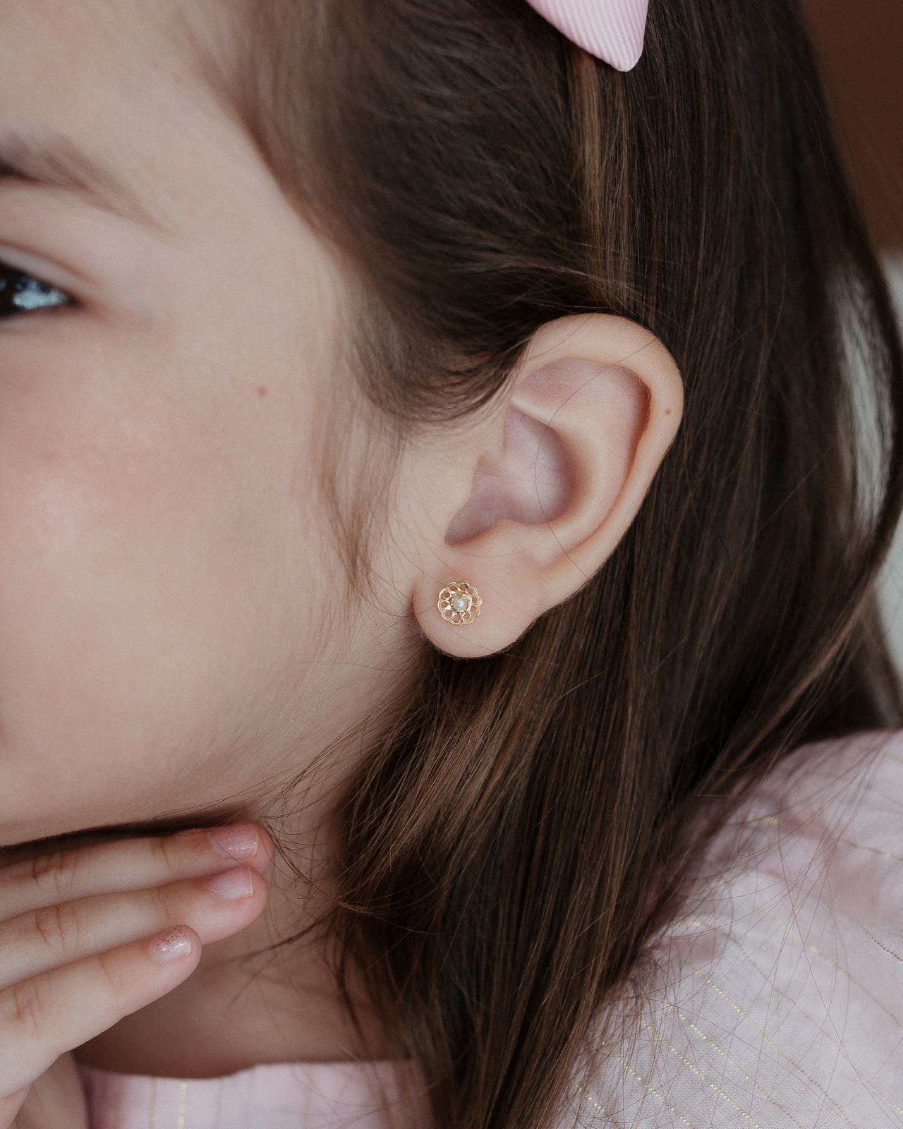 O Brinco Infantil Flor com Pérola da Pingo de Gente Joias foi criado para eternizar os primeiros momentos da infância com charme, conforto e total segurança.