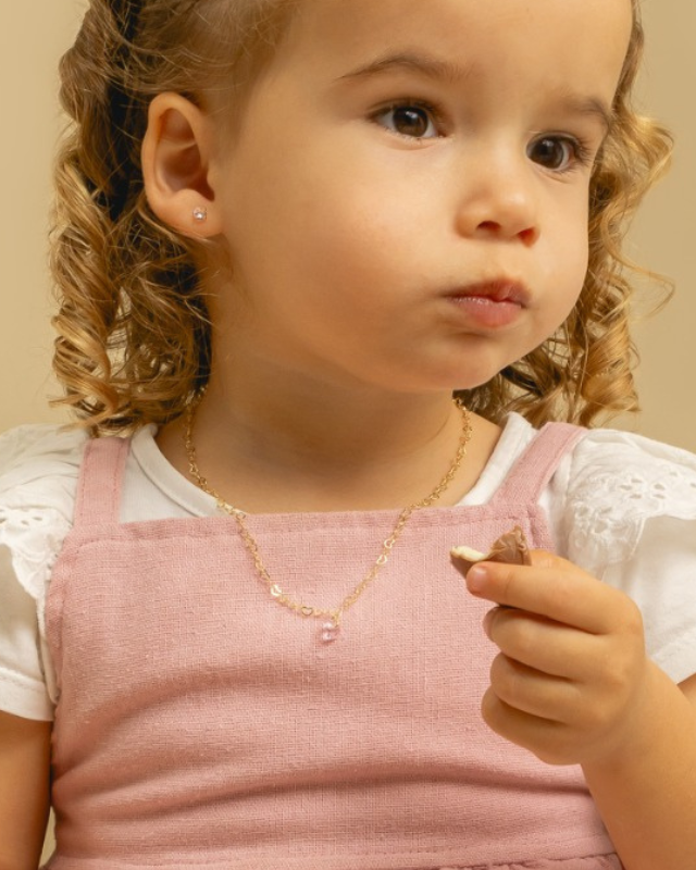 O Colar infantil Cora é a escolha perfeita para trazer charme e leveza ao visual da sua pequena. Com corrente de elos de corações vazados com pingente de coração em cristal rosado, ele combina suavidade e brilho na medida certa.