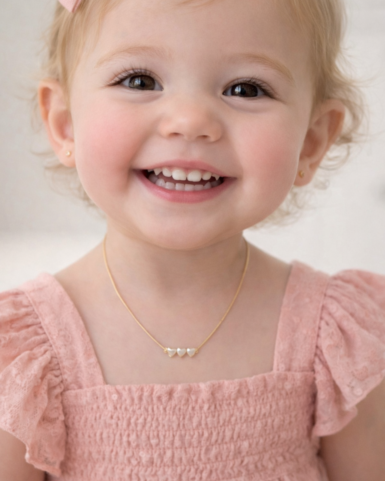 O Colar Infantil com 3 Corações de Pérolas é uma joia delicada e cheia de significado, criada para iluminar o look das pequenas com elegância e suavidade.