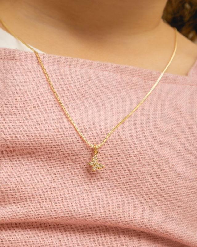 O Colar infantil Yara une delicadeza e charme em uma só peça. O colar traz uma corrente veneziana com pingente em formato de borboleta com micro zircônias cravejadas no cristal que refletem luz com sutileza e brilho encantador.