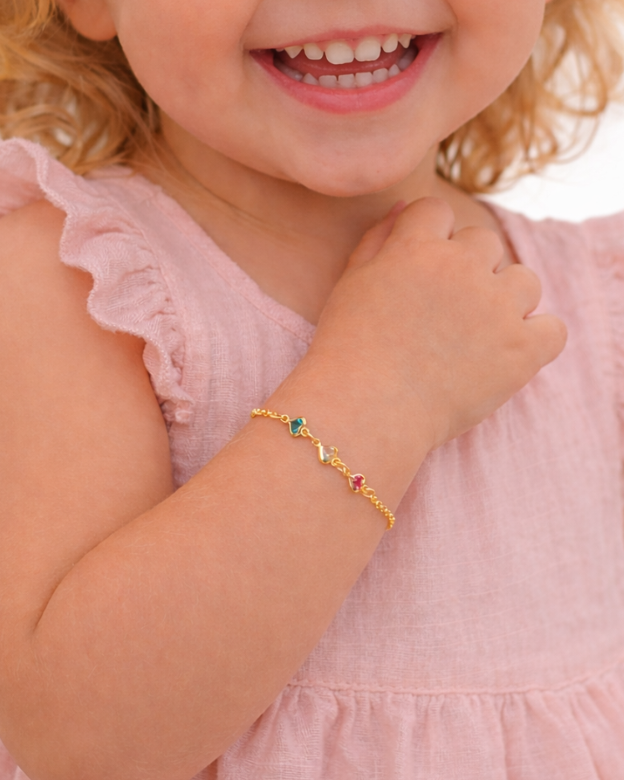 A Pulseira Infantil 3 Corações Coloridos é uma joia delicada que simboliza amor, carinho e momentos inesquecíveis da infância.
