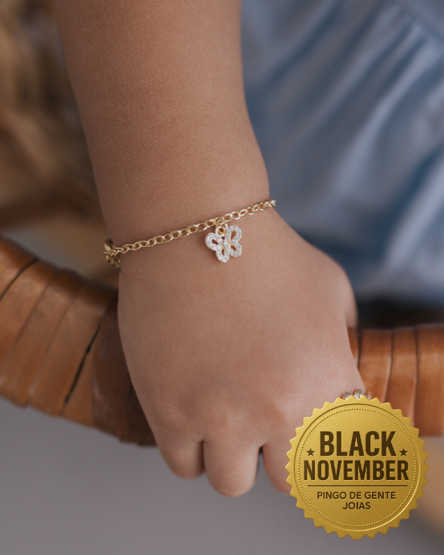 Pulseira com pingente de borboleta cravejada com pedras de zircônias no cristal na corrente de elos que ajusta no pulso da sua princesinha.