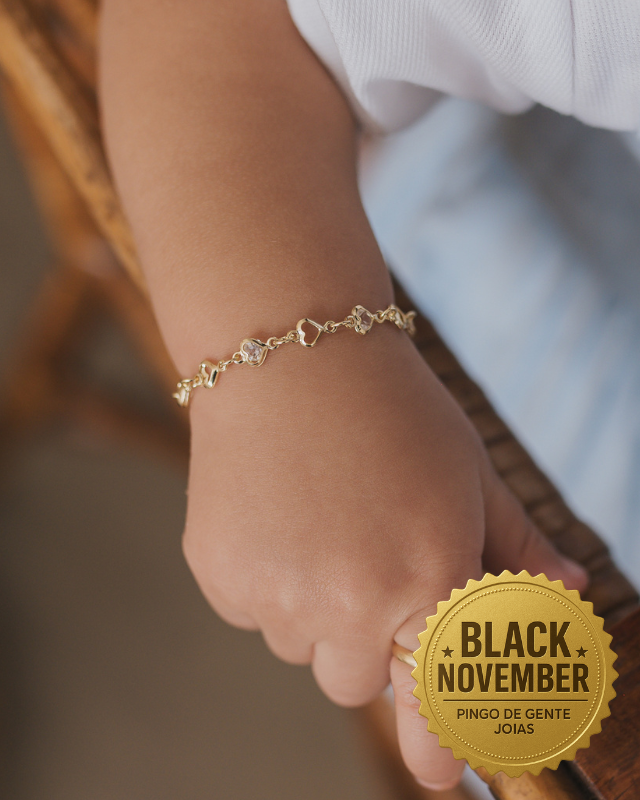 Pulseira com elos de corações sendo vazado e com cristais na corrente que ajusta no pulso da sua princesinha.